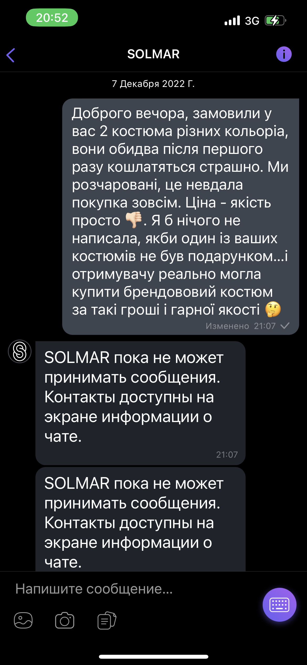 Доброго вечора, замовили 2 однакових костюми різного кольору, один для себе, другий в подарунок. Після першого разу як одягнула - почали кошлатитись відразу. Буди в шоці, тому зо паралельно замовили на іншому сайті майже вдвічі дешевше, але якість в два рази краща. Сказати що я незадоволена, це мало. Написала Solmar - просто ігнорують. Костюми неякісні. Жалію що зробила тут покупку.
