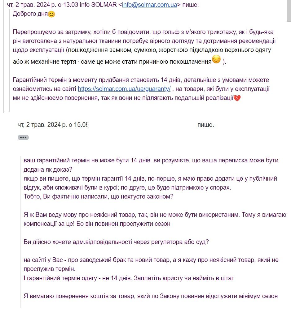 Побачила в інтернет-магазині гольф з імітацією корсета. Подібного ніде не бачила. Незважаючи на різні відгуки про бренд "Солмар", зокрема багато негативних, наважилася на покупку. Оскільки потеплішало, деякий час не вдягала. Тим часом, були із сім'єю в ТЦ в Одесі, натрапили на магазин бренду. І купили ще кілька речей, повелися на привабливі дизайн та кольори. Зараз радію щиро,що не купила більше, адже якість ніяка. Вийшло одягти гольф усього тричі. А він уже кошлатиться! У пранні не був, носився акуратно. На рукавах у зоні ліктів утворилися "заломи" іншого кольору. Фарба вицвіла. Виріб виглядає зношеним. Ношеним не 1 рік! І це за три рази використання! Нікчемна якість! Повне розчарування! Не рекомендую!!! П.С. Звернулася із описом проблеми, з фото дефектів та з претензією по якості до виробника. Попросила повернути кошти. Проте, фабрика не зацікавлена відстояти власну репутацію та втримати клієнтів. П.С.2. По Закону, якщо товарний вигляд одягу (одяг не прослужив сезон) не протримався сезон, виробник зобов'язаний повернути кошти за такий товар неналежної якості. Але виробник заявив, що гарантійний термін на товар - 14 днів! Тобто, його якість розрахована на два тижні. Майте це на увазі про купівлі! П.С.3. Гарантійний термін одягу не може бути меншим за сезон. Зі скаргами звертайтеся у ДержСпоживСлужбу, і через суд захищати свої права споживача те ж можно.