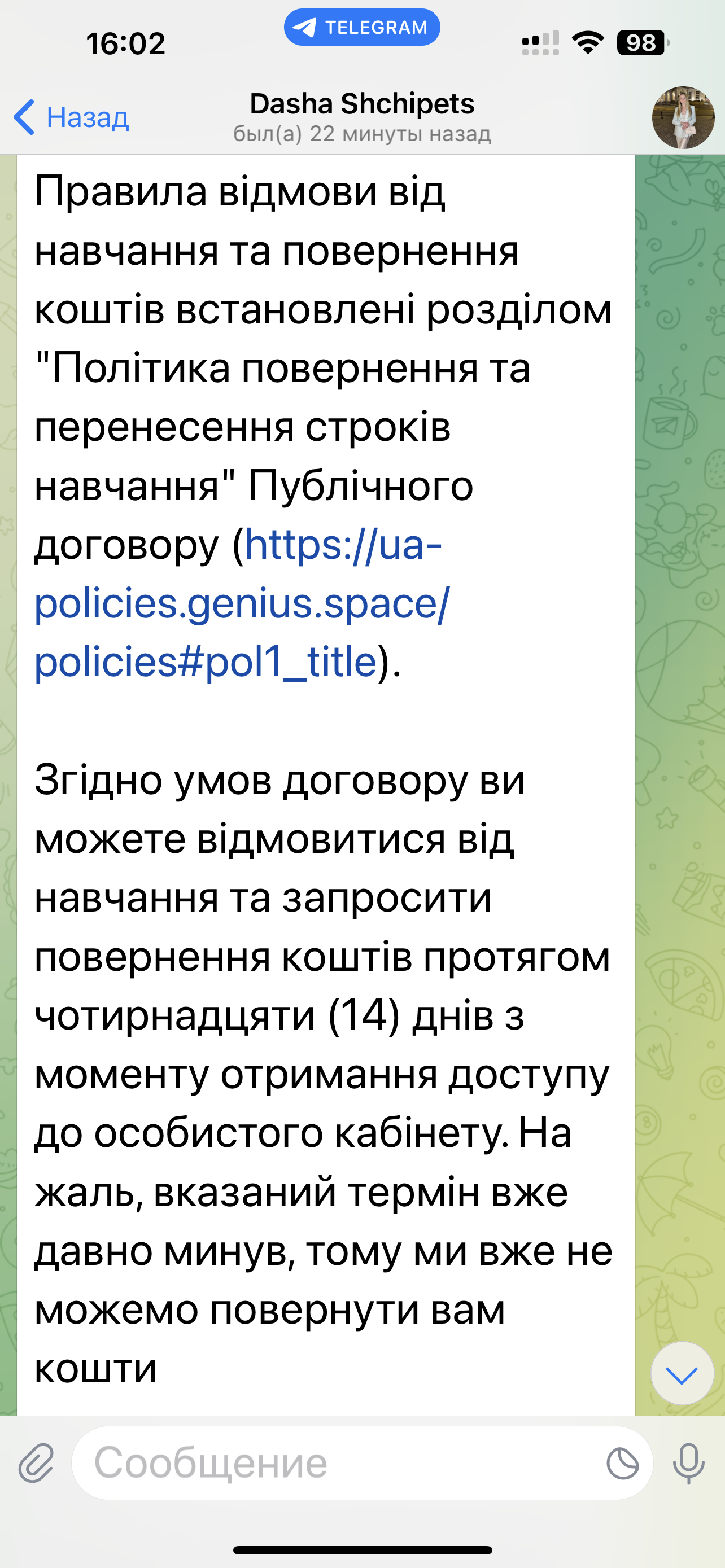 Мала "честь" придбати курс тестування ПЗ в Genius Space. Коли почала проходити даний курс, зрозуміла, що матеріал дуже сирий, а манера лекцій - неначе сиджу з друзями на чаюванні чи на тусовці, от чесно, занадто розхлябано все. Та і часу не було продовжувати це все знущання. Звернулась до куратора курсу стосовно скасування - одна з перших фраз "гроші вам не повернуть". Порадили контактувати з службою підтримки. Окей, не питання - пишу їм імейл. У відповідь "політика, пройшло більше 14 днів з дати покупки" і бла-бла-бла. Окей, так, дійсно пройшло більше 14 днів навіть з моменту початку курсу (придбала я його за пів місяці до старту потоку). Я й не прошу повну компенсацію, хоча б часткову. Бо за цей час пройшла лише 2 лекції. Задала їм пару уточнюючих питань: 1. Яким чином можливе повернення коштів у випадках, коли людина сплачує за курс заздалегідь, доступ до курсу відкривається більше, ніж за 14 днів з моменту покупки, а людина при цьому не задоволена якістю курсу, доступ до якого відкривається лише з дати запуску потоку? Адже це одна з причин, чому я не хочу продовжувати навчання та переносити дати на інший потік чи інший курс: - Манера викладення інформації лекторами неструктурована. Мовлення лекторів надто просторічне. - Презентації не містять тезисної інформації, про яку говорять, що спрощує сприйняття; - Курс бізнес англійської, який йшов додатком до пакету PRO, який я, власне, і придбала, містить багато помилок - як у вимові, так і в субтитрах. 2. Чи розумієте ви, який стан зараз в країні і що у людей ситуація може змінитись в секунду? І не завжди є змога слідувати раніше наміченим планам та цілям, на жаль. Чи враховуєте ви надзвичайні обставини, що склалися через воєнний стан в Україні? 3. Якщо я переглянула лише 2 лекції з 50, чому я не можу претендувати на хоча б часткове повернення коштів? На це все приходить мені відповідь на наступний день, де мене вже намагаються зробити злочинницею: "Ви повинні розуміти, що Політика повернення існує не просто так. Встановлені офертою терміни повернення та пов'язані утримання зумовлені тим, що ми витрачаємо значні кошти на організацію навчання (спікери, робота підрядників, маркетинг, реклама). Тому ми не можемо робити повернення всім охочим у будь-який час. Це звичайна практика. Те, що ви намагаєтеся зробити, - відмовитися від навчання з особистих причин, порушуючи встановлений порядок, - називається "одностороння відмова від угоди". Одностороння відмова від правочину не допускається, а зобов'язання припиняється лише його належним виконанням (Цивільний кодекс України)." За день до цієї відповіді мені ще дзвонили з сайту спитати про бронь курсу (випадково не те наклацала). При розмові з чоловіком, який телефонував, я сказала, власне, ті самі претензії до курсу. На що відповідь була: "Ой, ну йе ж лише на перших лекціях так. Ви побільше повчіться, може далі краще буде. А бізнес англійська - то ж додатковий курс, він ні на що не впливає". Що ж, дуже цікаве ставлення Genius Space до власного ж контенту, до своїх кліжнтів, тим паче за умов повномасштабної війни в Україні. Поки люди втрачають житло через бойові дії або раптово можуть бути мобілізовані, цим людям треба гроші на "організацію спікерів", хоча всі відео були записані ще десь в 2021 році, судячи з контексту. "Бізнес англійська? Ой, та вона взагалі не треба. Але ви заплатіть більше грошей за ПР