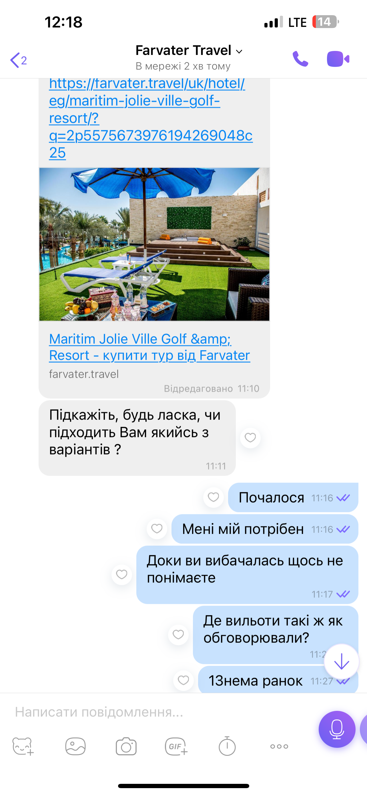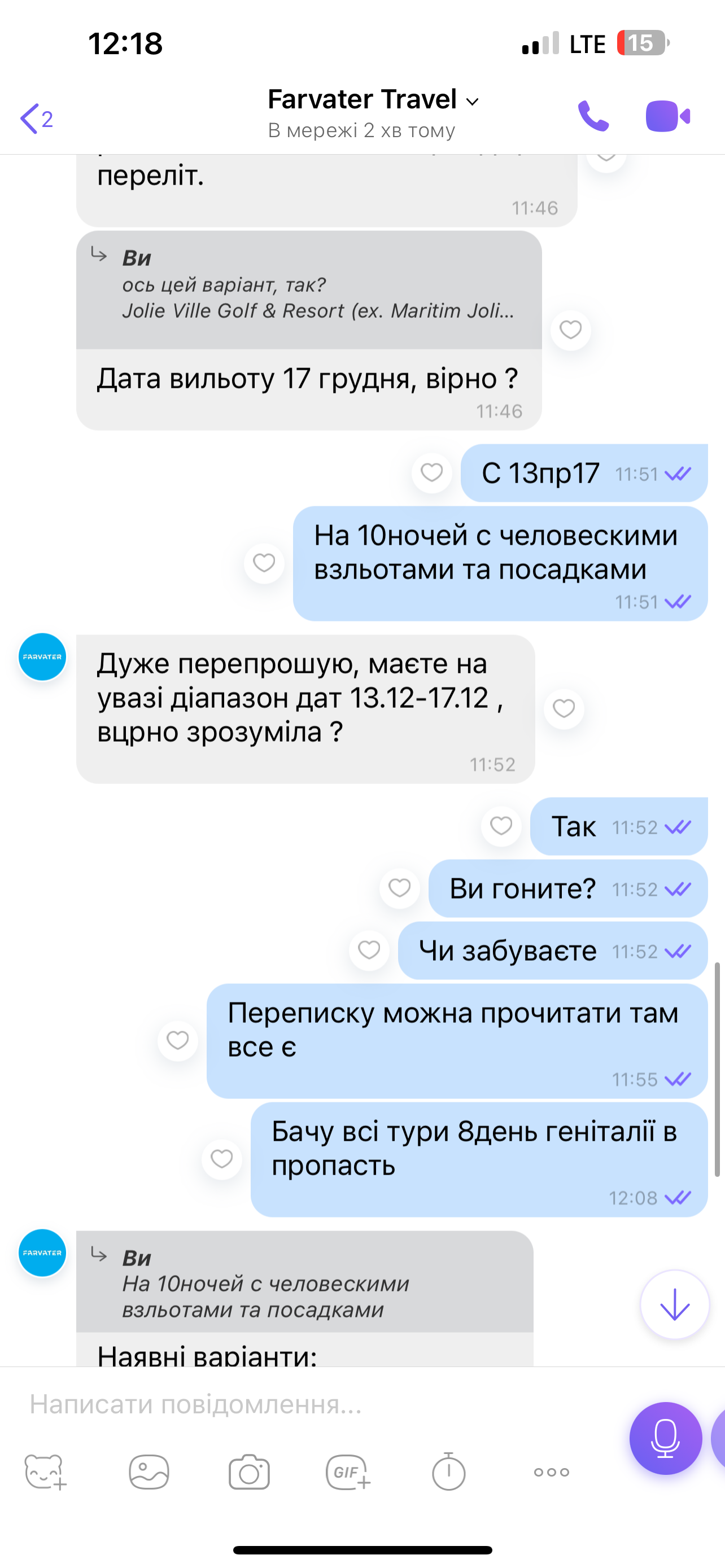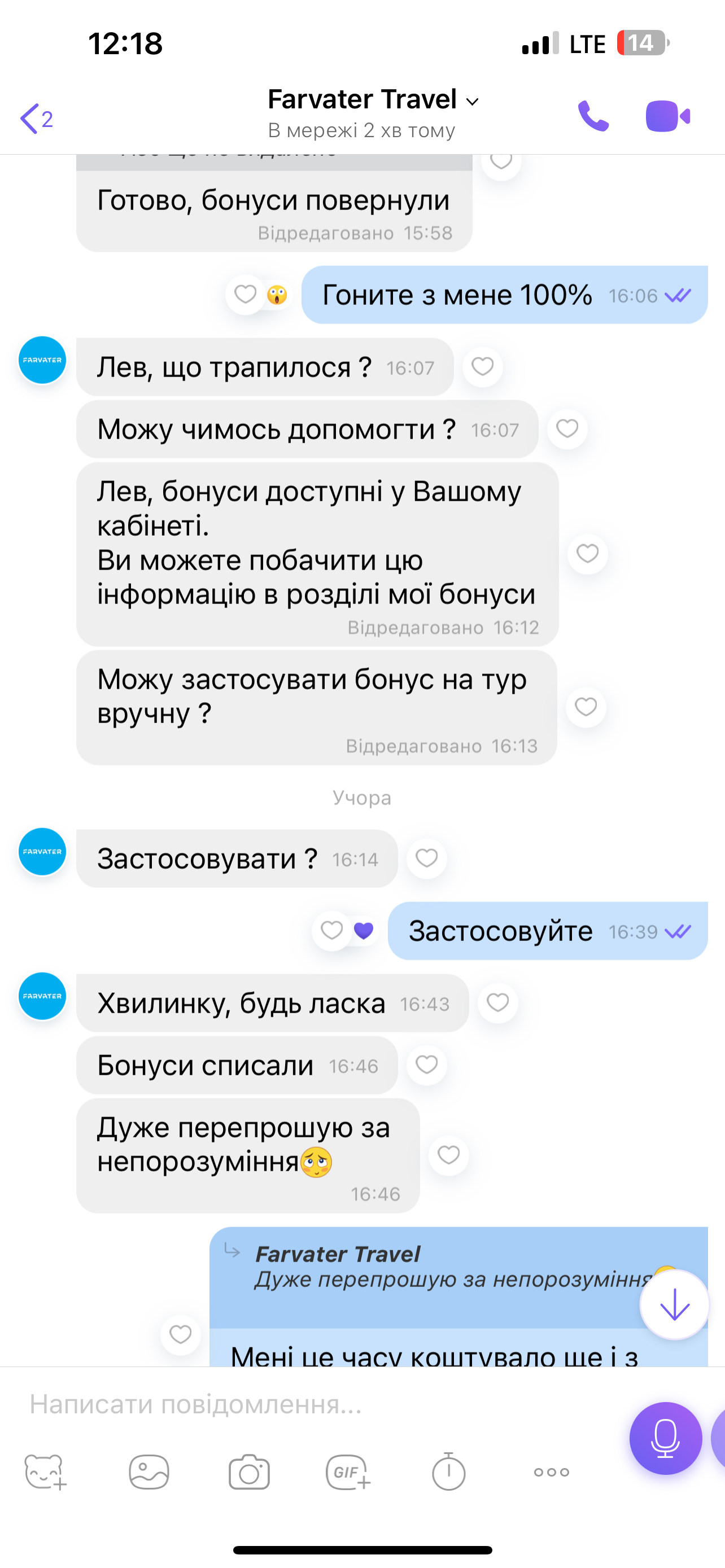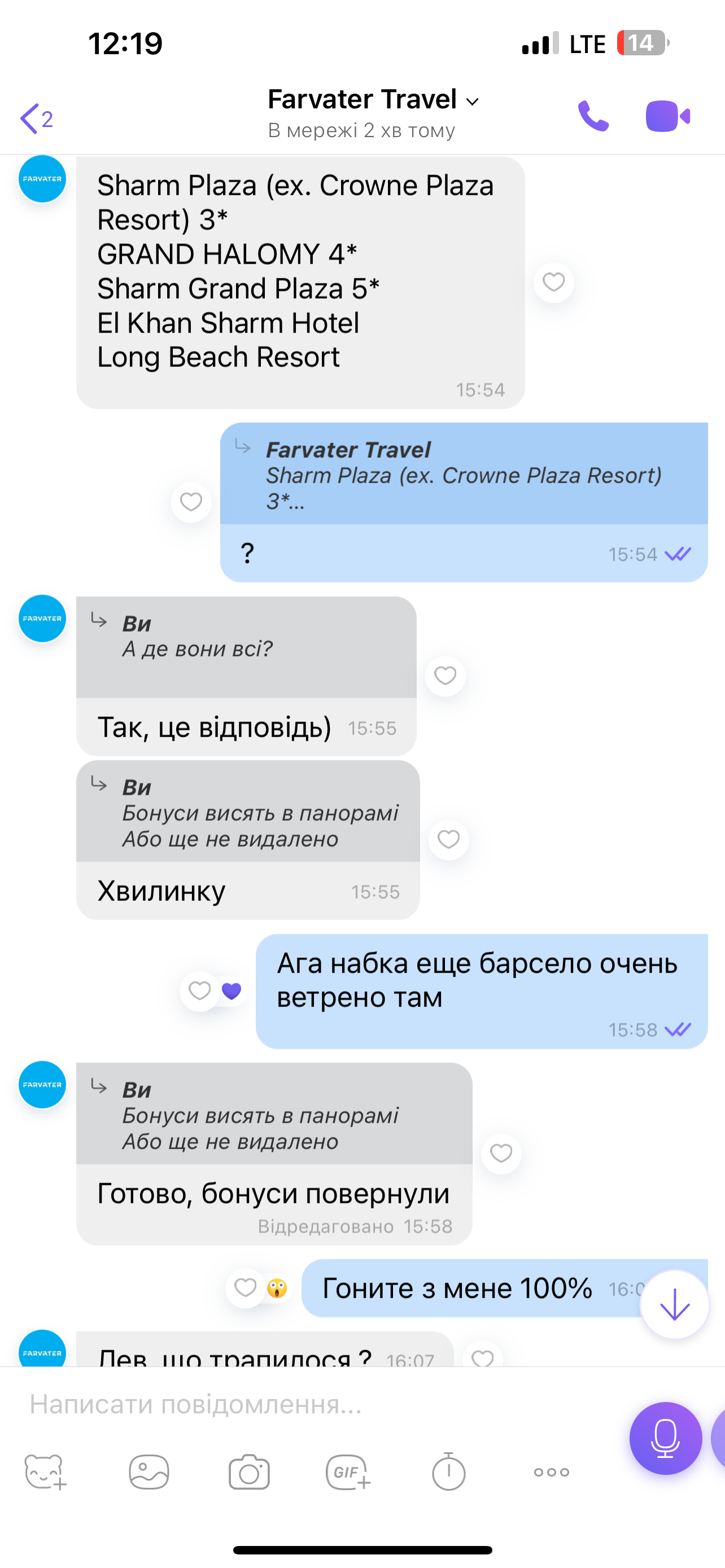 Опишу свій досвід туризму з Farvater Travel а кожен уже хай робить свої висновки. Була підписана на сторінки компанії кілька років , тому коли брала тур навіть не сумнівалася, думала все буде ок. По факту, такого раздолбайства не бачиланіде. 1. Автобусний тур в Болгарію, готель вибирали самі. А далі почалось цікаве: з менеджера Катерини доводилося трохи не з боєм витягувати інформацію де зупинка автобуса, де кінцева зупинка на маршруті. Самі квитки на автобус так і не прислали. У день відправки 6-40 ми приїжджаємо на зазначене місце (відправка о 7), стоїть 8 автобусів нашого автобуса немає. Мене питають про квитки, квитків немає. Я, як ошпарена, бігаю між ними, намагаюсь дозвонитися - ніхто не бере слухавку. О 6-50 автобус приїхав, розібрались, ми в списках (добре, що хоч список пасажирів туроператор дублює для водія), хоча питання квитків відкрите. О 9-15 побачивши мої пропущені дзвінки, нарешті написали і вислали квитки (Дуже вчасно!). Вирішую не заводитися і не витрачати відпустку на конфлікт їдемо... 2. 26.06 (повернення у нас 28.06), пам'ятаючи ситуацію, запитую коли будуть зворотні квитки, мене заспокоюють, що ввечері напередодні виїзду. Ок, 27.06 до 18 години проводимо з дітьми в готелі, квитків нема, зберігаю спокій, йдемо в останній раз на набережну, повертаємось о 21, квитків нема. Тиша. Починаю нервувати, тим більше, що на сайті перевізника (з якого вони як турагент мають просто переслати ті квитки) чітко вказано, що квитки видаються з 15 до 18. О 21-30 вже пишу сама, тиша. Починаю писати у всі соцмережі Farvater Travel. О 23-45 мадам нарешті відсилає мені якусь ліву писульку, що не має жодного відношення до наших зворотних квитків. Щоб ви розуміли ситуацію - щодня з Болгарії їдуть десятки туристичних автобусів, просто піти на місце зупинки і ловити потрібний не знаючи ні його номер, ні маршрут, не варіант, тим більше (оскільки моніторила чат перевізника) знала, що в останні дні час виїзду можуть перенести (що у нас і відбулось). О 00:15 після числених дзвінків мадам нарешті взяла слухавку. Хвилин 10 намагалась мені шось брехати про "системний збій" аж поки нарешті не вислала номер автобуса і телефон супроводжуючої. Квитки так і не вислала. В цей же момент я дізнаюсь, що час виїзду нам перенесли. Якби мої відгуки не підтерли на фб, можна було б ще вважати, що то одна менеджерка така. А так то не лише кругова порука, а і в принципі нормальний стиль роботи компанії. Тобто, якщо коротко і є можливість - обирайте іншу компанію. Готель ми вибирали самі, тур сформований туроператором, який також обирає перевізника. Єдина задача Фарватеру, за яку ви платите гроші - це вчасно передати вам інформацію і всі документи для туру. А саме тут у них "системний збій". Не уявляю як при такій роботі вони здатні вирішити будь-яку позаштатну ситуацію, яких в туризмі виникає безліч. Категорично не рекомендую компанію.