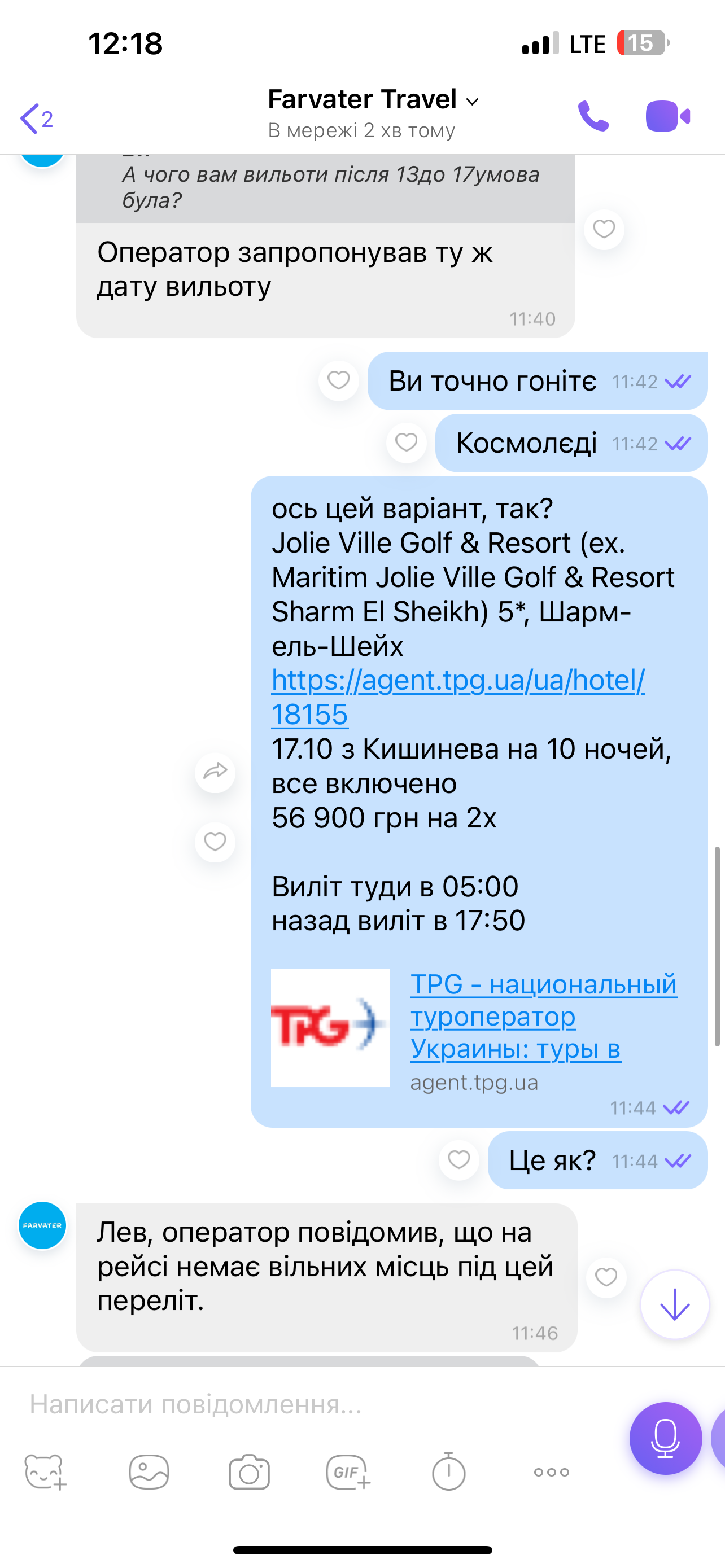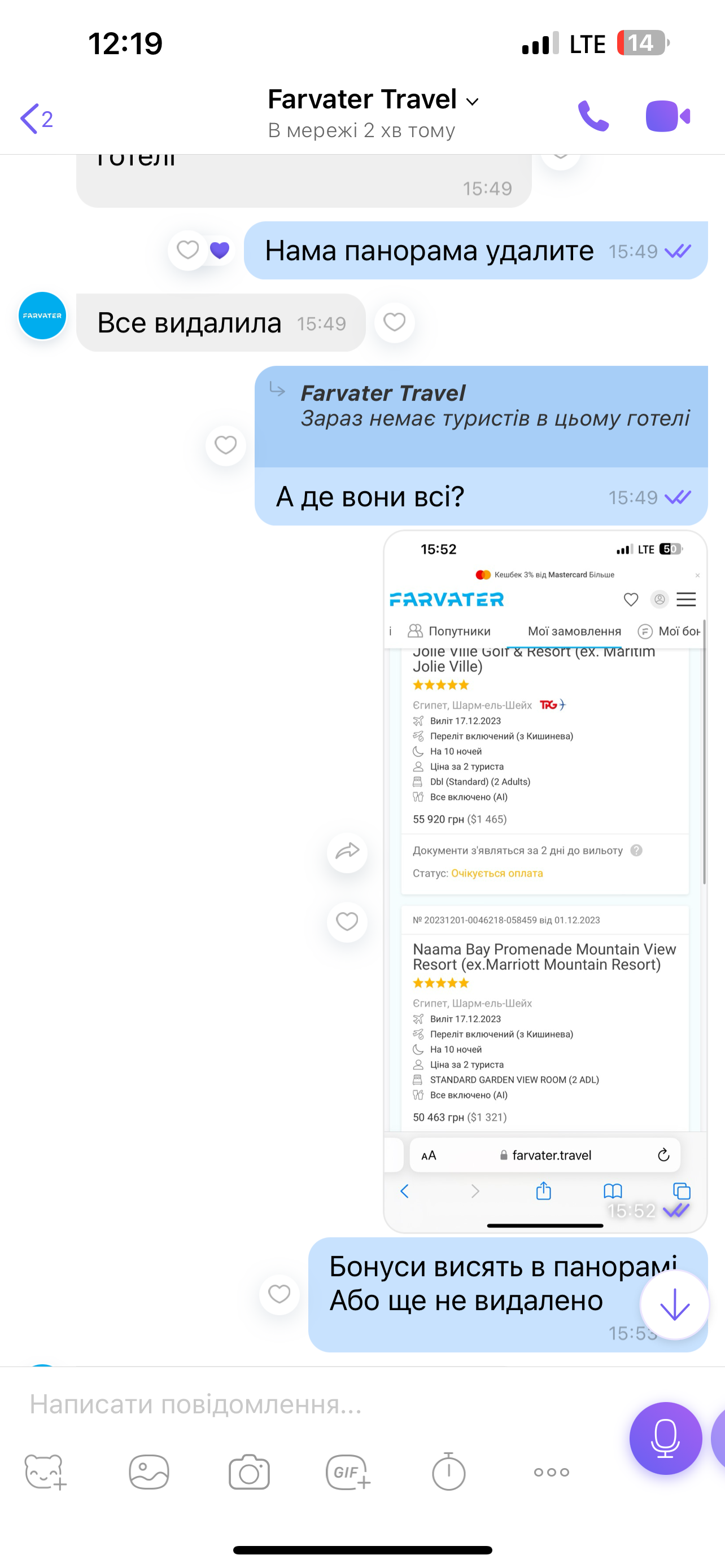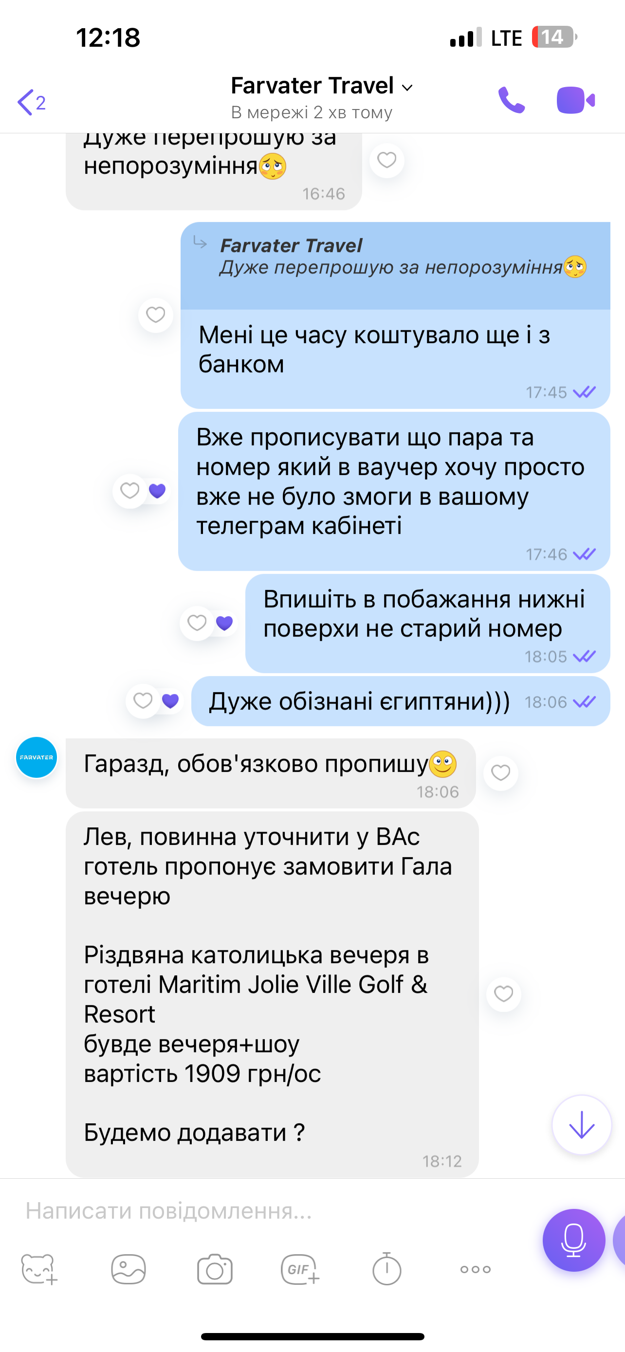 Опишу свій досвід туризму з Farvater Travel а кожен уже хай робить свої висновки. Була підписана на сторінки компанії кілька років , тому коли брала тур навіть не сумнівалася, думала все буде ок. По факту, такого раздолбайства не бачиланіде. 1. Автобусний тур в Болгарію, готель вибирали самі. А далі почалось цікаве: з менеджера Катерини доводилося трохи не з боєм витягувати інформацію де зупинка автобуса, де кінцева зупинка на маршруті. Самі квитки на автобус так і не прислали. У день відправки 6-40 ми приїжджаємо на зазначене місце (відправка о 7), стоїть 8 автобусів нашого автобуса немає. Мене питають про квитки, квитків немає. Я, як ошпарена, бігаю між ними, намагаюсь дозвонитися - ніхто не бере слухавку. О 6-50 автобус приїхав, розібрались, ми в списках (добре, що хоч список пасажирів туроператор дублює для водія), хоча питання квитків відкрите. О 9-15 побачивши мої пропущені дзвінки, нарешті написали і вислали квитки (Дуже вчасно!). Вирішую не заводитися і не витрачати відпустку на конфлікт їдемо... 2. 26.06 (повернення у нас 28.06), пам'ятаючи ситуацію, запитую коли будуть зворотні квитки, мене заспокоюють, що ввечері напередодні виїзду. Ок, 27.06 до 18 години проводимо з дітьми в готелі, квитків нема, зберігаю спокій, йдемо в останній раз на набережну, повертаємось о 21, квитків нема. Тиша. Починаю нервувати, тим більше, що на сайті перевізника (з якого вони як турагент мають просто переслати ті квитки) чітко вказано, що квитки видаються з 15 до 18. О 21-30 вже пишу сама, тиша. Починаю писати у всі соцмережі Farvater Travel. О 23-45 мадам нарешті відсилає мені якусь ліву писульку, що не має жодного відношення до наших зворотних квитків. Щоб ви розуміли ситуацію - щодня з Болгарії їдуть десятки туристичних автобусів, просто піти на місце зупинки і ловити потрібний не знаючи ні його номер, ні маршрут, не варіант, тим більше (оскільки моніторила чат перевізника) знала, що в останні дні час виїзду можуть перенести (що у нас і відбулось). О 00:15 після числених дзвінків мадам нарешті взяла слухавку. Хвилин 10 намагалась мені шось брехати про "системний збій" аж поки нарешті не вислала номер автобуса і телефон супроводжуючої. Квитки так і не вислала. В цей же момент я дізнаюсь, що час виїзду нам перенесли. Якби мої відгуки не підтерли на фб, можна було б ще вважати, що то одна менеджерка така. А так то не лише кругова порука, а і в принципі нормальний стиль роботи компанії. Тобто, якщо коротко і є можливість - обирайте іншу компанію. Готель ми вибирали самі, тур сформований туроператором, який також обирає перевізника. Єдина задача Фарватеру, за яку ви платите гроші - це вчасно передати вам інформацію і всі документи для туру. А саме тут у них "системний збій". Не уявляю як при такій роботі вони здатні вирішити будь-яку позаштатну ситуацію, яких в туризмі виникає безліч. Категорично не рекомендую компанію.