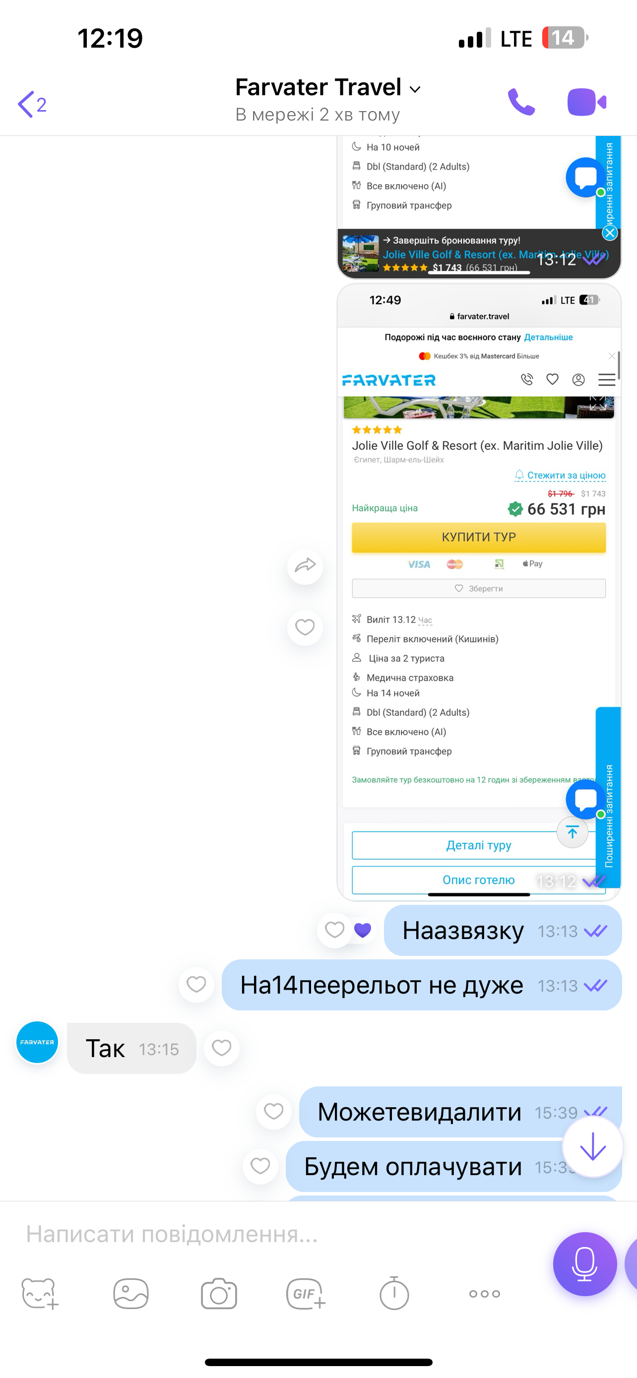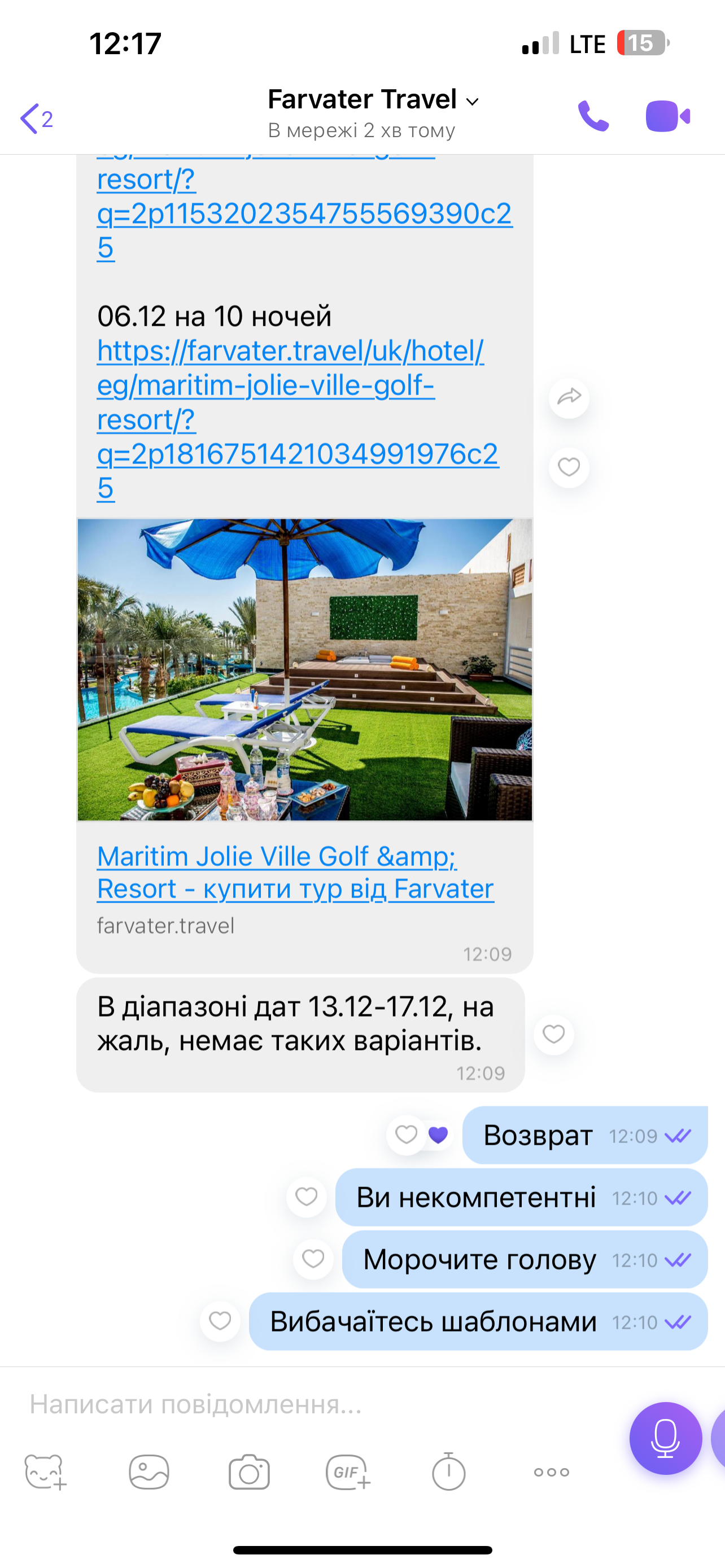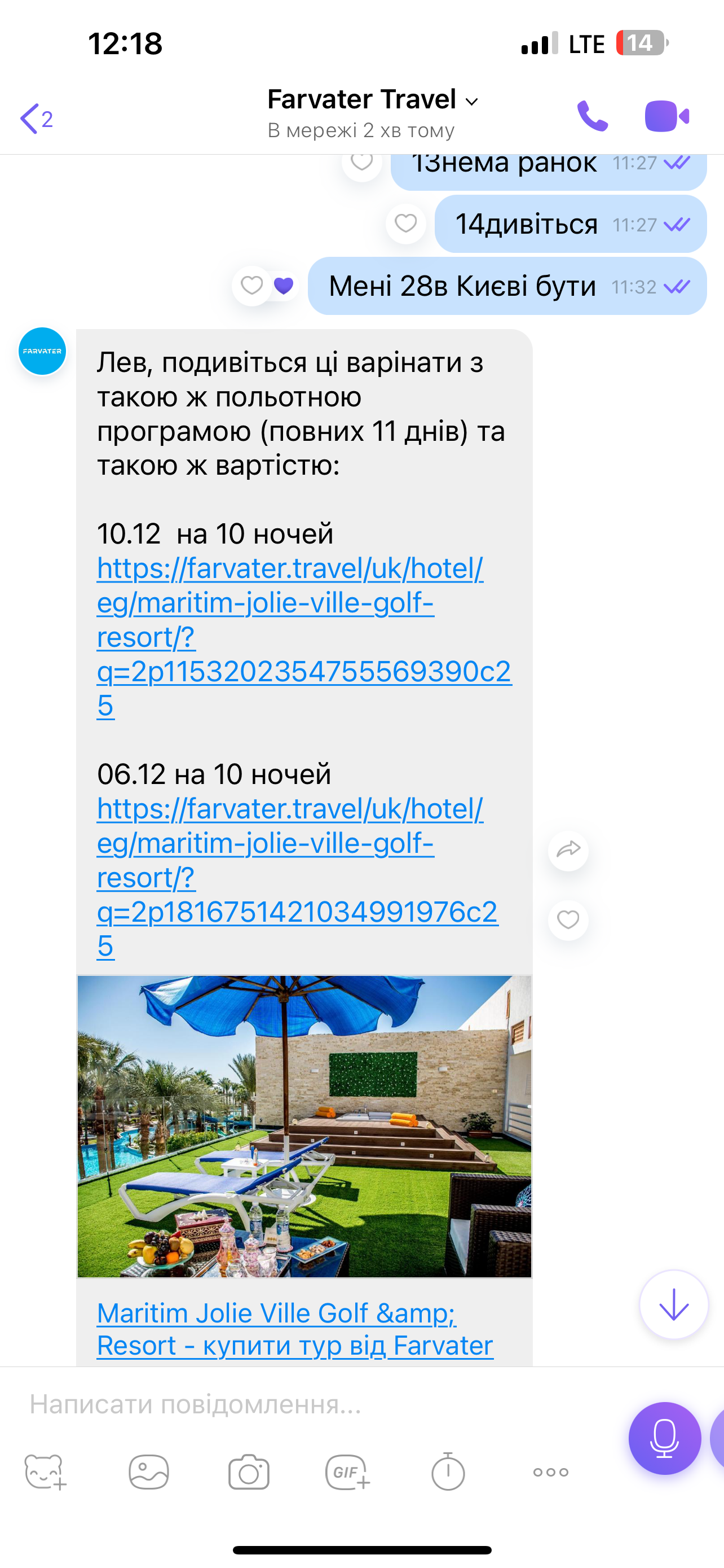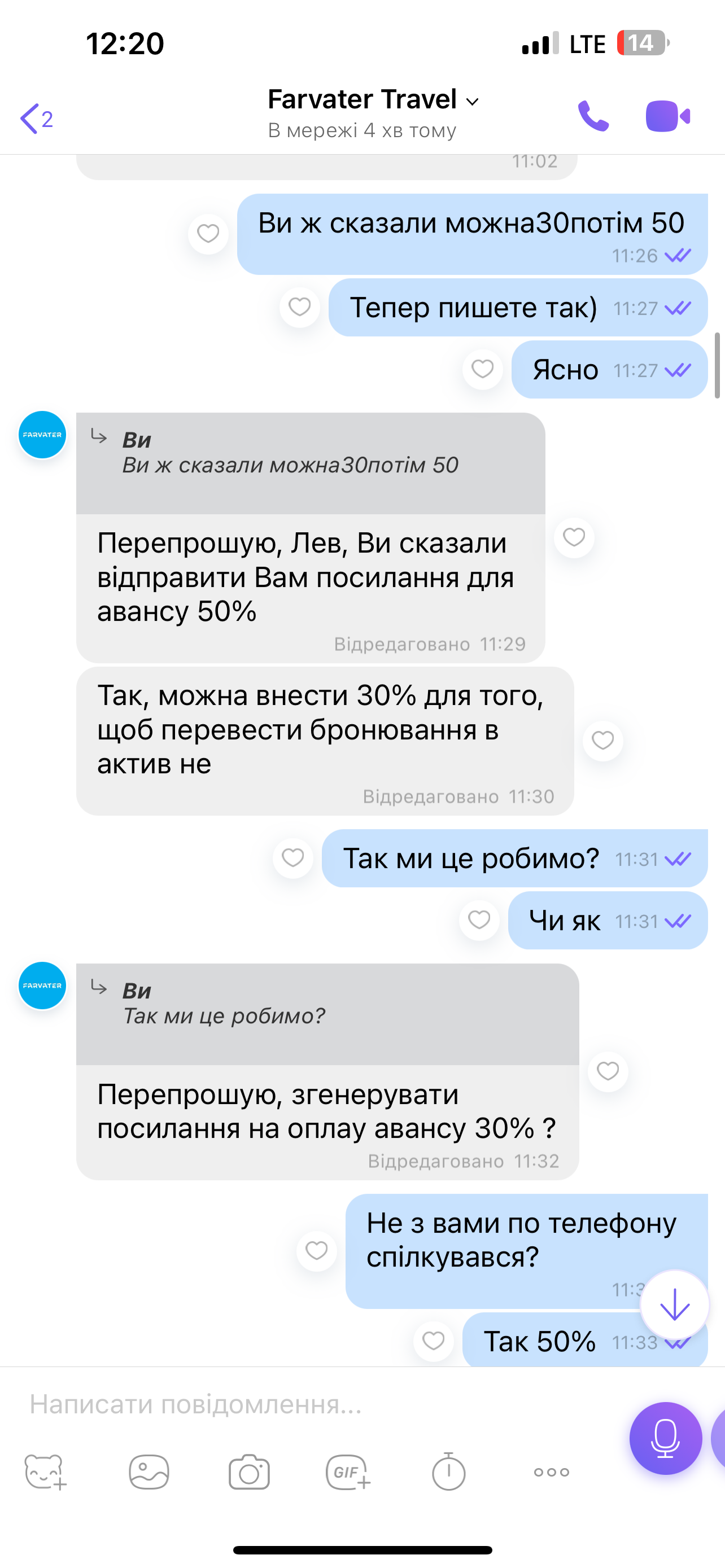 Опишу свій досвід туризму з Farvater Travel а кожен уже хай робить свої висновки. Була підписана на сторінки компанії кілька років , тому коли брала тур навіть не сумнівалася, думала все буде ок. По факту, такого раздолбайства не бачиланіде. 1. Автобусний тур в Болгарію, готель вибирали самі. А далі почалось цікаве: з менеджера Катерини доводилося трохи не з боєм витягувати інформацію де зупинка автобуса, де кінцева зупинка на маршруті. Самі квитки на автобус так і не прислали. У день відправки 6-40 ми приїжджаємо на зазначене місце (відправка о 7), стоїть 8 автобусів нашого автобуса немає. Мене питають про квитки, квитків немає. Я, як ошпарена, бігаю між ними, намагаюсь дозвонитися - ніхто не бере слухавку. О 6-50 автобус приїхав, розібрались, ми в списках (добре, що хоч список пасажирів туроператор дублює для водія), хоча питання квитків відкрите. О 9-15 побачивши мої пропущені дзвінки, нарешті написали і вислали квитки (Дуже вчасно!). Вирішую не заводитися і не витрачати відпустку на конфлікт їдемо... 2. 26.06 (повернення у нас 28.06), пам'ятаючи ситуацію, запитую коли будуть зворотні квитки, мене заспокоюють, що ввечері напередодні виїзду. Ок, 27.06 до 18 години проводимо з дітьми в готелі, квитків нема, зберігаю спокій, йдемо в останній раз на набережну, повертаємось о 21, квитків нема. Тиша. Починаю нервувати, тим більше, що на сайті перевізника (з якого вони як турагент мають просто переслати ті квитки) чітко вказано, що квитки видаються з 15 до 18. О 21-30 вже пишу сама, тиша. Починаю писати у всі соцмережі Farvater Travel. О 23-45 мадам нарешті відсилає мені якусь ліву писульку, що не має жодного відношення до наших зворотних квитків. Щоб ви розуміли ситуацію - щодня з Болгарії їдуть десятки туристичних автобусів, просто піти на місце зупинки і ловити потрібний не знаючи ні його номер, ні маршрут, не варіант, тим більше (оскільки моніторила чат перевізника) знала, що в останні дні час виїзду можуть перенести (що у нас і відбулось). О 00:15 після числених дзвінків мадам нарешті взяла слухавку. Хвилин 10 намагалась мені шось брехати про "системний збій" аж поки нарешті не вислала номер автобуса і телефон супроводжуючої. Квитки так і не вислала. В цей же момент я дізнаюсь, що час виїзду нам перенесли. Якби мої відгуки не підтерли на фб, можна було б ще вважати, що то одна менеджерка така. А так то не лише кругова порука, а і в принципі нормальний стиль роботи компанії. Тобто, якщо коротко і є можливість - обирайте іншу компанію. Готель ми вибирали самі, тур сформований туроператором, який також обирає перевізника. Єдина задача Фарватеру, за яку ви платите гроші - це вчасно передати вам інформацію і всі документи для туру. А саме тут у них "системний збій". Не уявляю як при такій роботі вони здатні вирішити будь-яку позаштатну ситуацію, яких в туризмі виникає безліч. Категорично не рекомендую компанію.