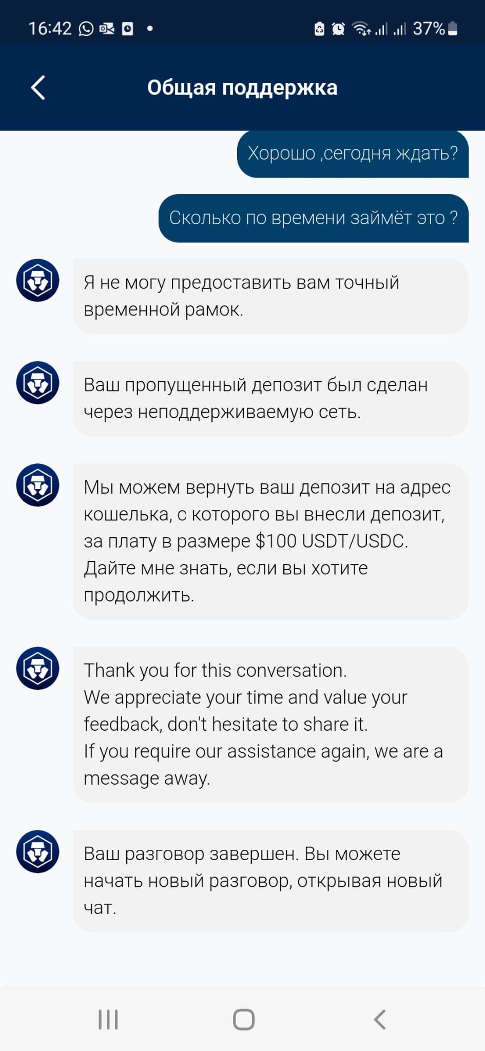 Биржа - ужас. 1) На удаётся пройти этап верификации лица по причине зависания приложения. При этом камера и приложение на этапе верификации ID работало корректно. 2) Чат-бот на сайте не работает. Не работает соединение с оператором. 3) Отдельной почты для связи с техподдержкой нет. Пришлось писать на основной адрес contact@crypto.com. Мне конечно никто не ответил за 18 часов. 4) В Телеграме я описал проблему в основном чате биржи. Люди, представляющиеся техподдержкой (человека 4-5), писали мне в личные сообщения. И как только они пытались узнать хоть что-то из моей личной информации я требовал доказательств того, что они действительно техподдержка, а не мошенники. Никто этого не сделал. Вывод: в телеграм-чате действуют абсолютно некомпетентные сотрудники, либо телеграм-чат полон мошенников. Если так работает биржа из топ-рейтинга, то что происходит в менее известных и значимых? Даже думать об этом не хочется.