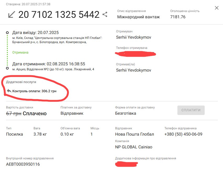 На отделение НП пришла посылка 20710213255442 из Китая, стоимостью 7181.76 грн. Новая почта насчитала на неё таможенный сбор 6 грн, и за услуги ещё 300 грн. При этом стоимость посылки превышала порог бестаможенного ввоза (150 евро) всего на 20 грн. Эта организация - самый жадный перевозчик на территории Украины; им мало огромных тарифов на перевозки - они не гнушаются даже брать по 300 грн. за 6-гривневый таможенный сбор. На Алиэкспрессе нельзя выбирать перевозчика, и нелюди из Новой почты этим пользуются, выставляя драконовские тарифы. А заявляют при этом, что "Вартість послуг з митного декларування відправлень, що надаються ТОВ «НП Глобал», складає 3% від різниці між вартістю замовлення та сумою порогу безмитного ввезення - 150 Євро". Только если бы это было правдой, то от моей разницы в 20 грн они бы взяли всего 60 копеек.