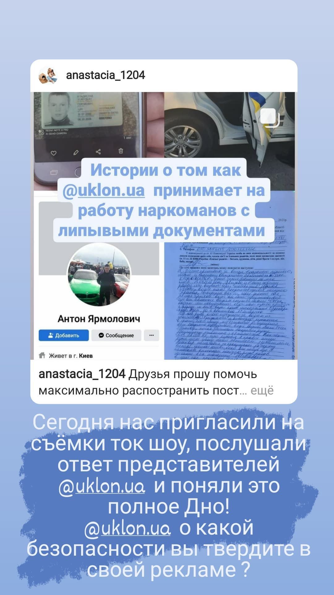Воскресенье  ночью с мужем попали в дтп на свой машине, воспользовавшись услугой трезвый драйвер. Вызвали водителя, он приехал ,говорит я Владислав ,водитель от уклон. Сели в тачку и поехали домой. Проезжая Вышгород  водитель начал съезжать  резко с полосы, муж его двинул в руку,мол ты чего . На что был ответ водителя ,я уснул . Мы зацепили рядом проезжавщую машину.Остановились вызывать копов,тип начал истерично предлагать деньги мол тут чуть , сейчас все привезут.У меня полная каска и мне все равно на его деньги ,мы все равно начали вызывать копов, товарищ из уклона бросив все ,начал бежать как лань в сторону домов.Каким то чудом мимо проезжал патруль и увидел что ,тип бежит и стоит 6 чел с круглыми глазами,  водитель со второй машины начал его  догонять.В итоге поимали этого типа, привезли и при обыске нашли наркотики в его сумке ,он признался что тоже был под феном и началась попускать.И это ещё не все )Начали проверять доки, тип показал в Диии паспорт и под дурака начал называться чужим именем ,у мужа стоит приложение в телефоне  гетконтакт,начали проверять номер ,там подписан по другому. Плюс в добавок выяснилось что в уклоне тоже его фальшивые документы .Обратились в уклон  с регистрацией дтп, они отморозились , сказали ваши проблемы и вообще без запроса от полиции и без наших юристов общаться с вами не будем. После звонка аннулировать заказ Товарищ  долго отрицал, что он с поддельными документами ,в следствии выяснилось что он ещё и без прав.  Полицаи в отделении помогли написать куча заявок на него и уклон, пока писала все, он таки признался ,что был с фальшивми доками, что под ними зарегистрирован в уклоне.Общаясь с  копами которые привезли нас всех в РУВД и помогали бумажки написать,сказали что у него там 4 статью . Но есть вероятность ,что все равно водителю  ничего не грозит, максимум админ штраф, что касается уклона,  то им тоже ничего не грозит. Место происшествия было в Вышгороде въезд на дамбу, после того как отошли от экшена, я понимаю что могло закончится на дамбе все очень плохо из наркомана и службы уклон.Вчера уклон звонили моему супругу и предложили компенсации в 700 грн на счёт их услуг.У меня новая машина ниссан х trail ,каско мне отказывает в ремонте, так как третье лицо было под наркотиками,  ремонт обойдётся от 30 тыс грн .Но уклон оценил нашу безопасность с их водителем в 700 грн!про ремонт моей машины вообще никто не говорит.Есть телефоны разговор записанный . Пожалуйста ,помогите распространить информацию, мы чудом остались живы,а такие водители будут дальше садится за руль...его отпустили , и не факт что он снова не таксует  Полиция не видит состава преступления,  только 3 админ штрафа...